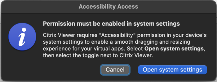 Starting with version 2411, the seamless drag and resize enhancement feature is automatically enabled when Citrix Workspace app for Mac connects to a Windows VDA version 2311 or later. This enhancement provides a smoother drag and resize experience for virtual apps, ensuring seamless interaction. This feature requires user-provided Accessibility permissions. If Citrix Viewer does not have the necessary permissions, a prompt appears requesting Accessibility permission.