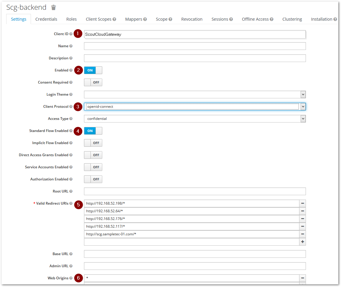Option Description Settings > Client ID Name of your client / application Settings > Valid Redirect URIs One or more SCG addresses to which Keycloak forwards users after successful authentication -