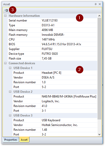 For the selected device, in the Properties window, on the Assets tab, device-specific hardware information is shown: