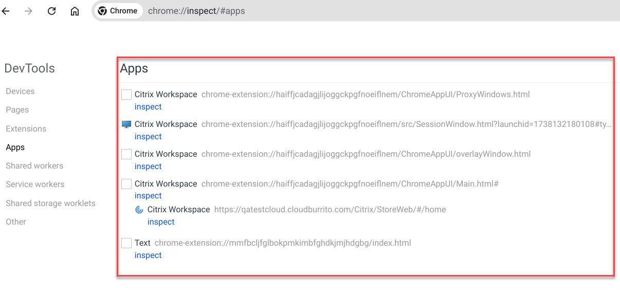 1. Citrix WorkspaceアプリのGoogle Chromeブラウザーでchrome://inspect/#appsページを開きます。